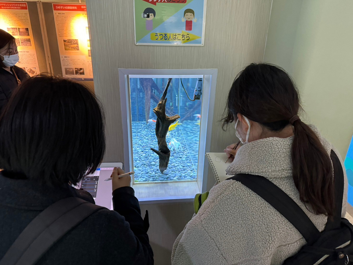 淡水魚から海亀やサメ、ペンギンまで幅広く飼育されており、各々自由にスケッチを楽しみました。