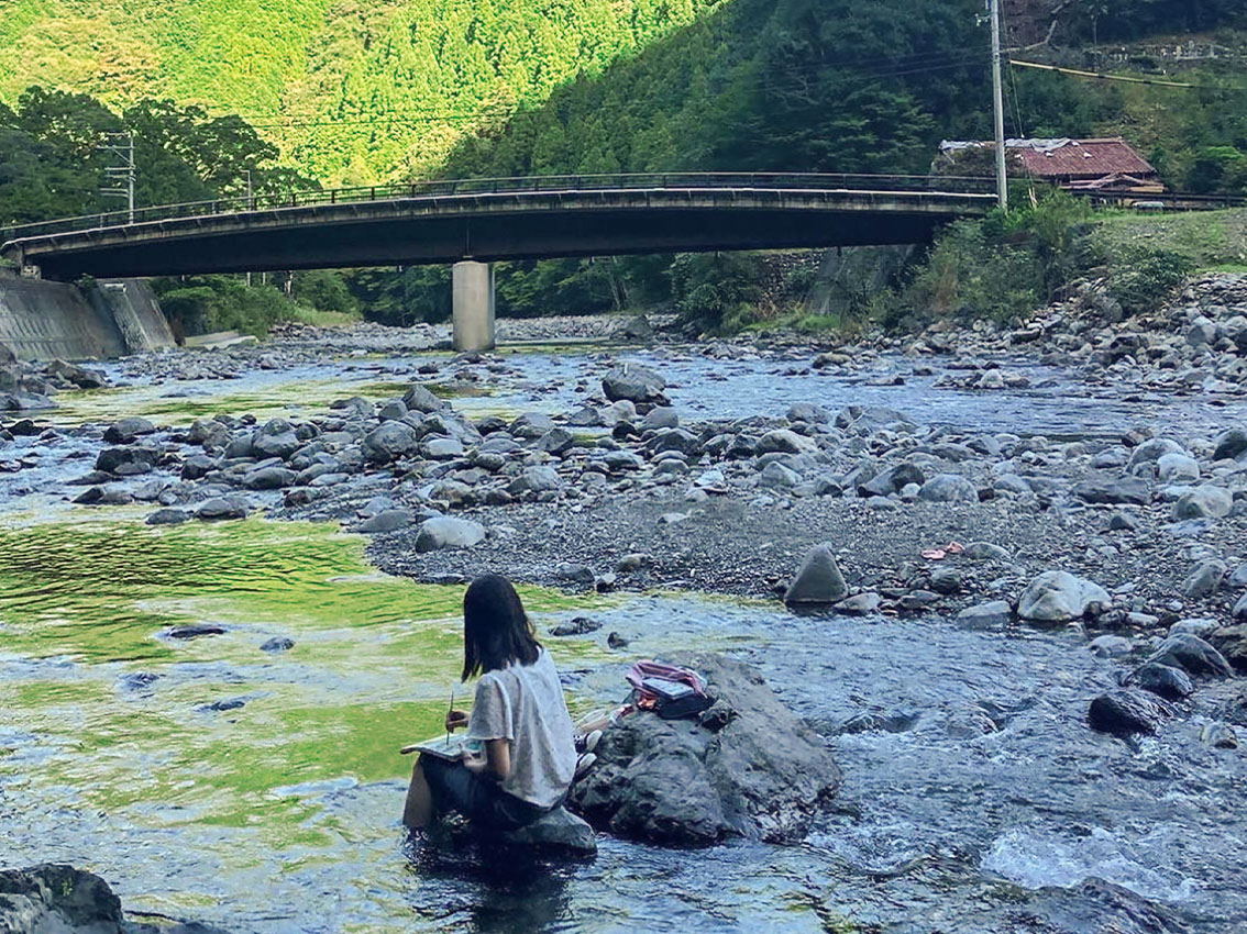 1日目は民宿の前の川で水遊びをしながらスケッチをし、夜は人狼ゲームで盛り上がったりカブトムシを探しに行ったり