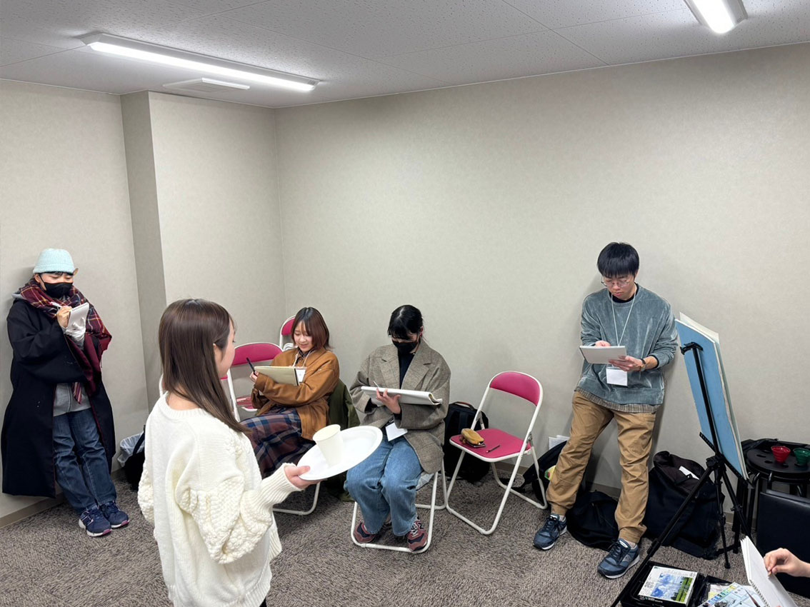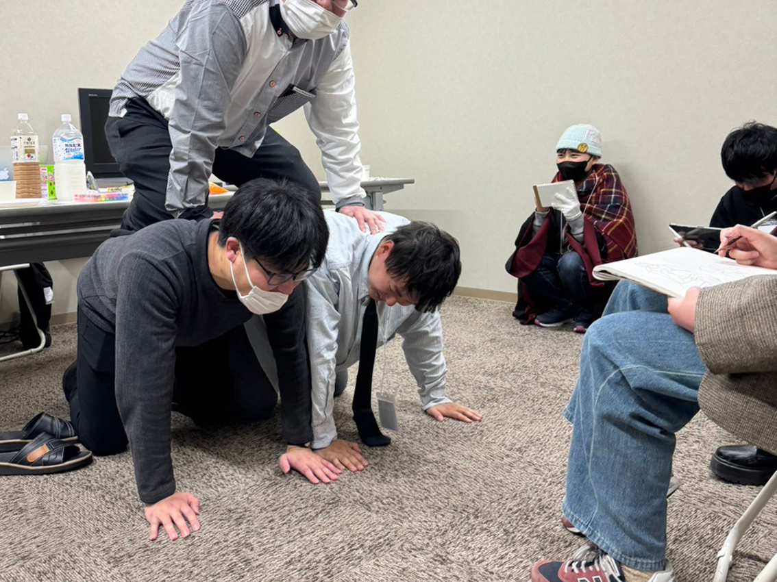 モデルクロッキー会ではみんな意欲的にクロッキーに打ち込みました。モデルさんが来るまではA-artの運営スタッフがモデルを代行。普通のモデルは絶対しないポーズで笑いながらクロッキーを楽しみました。